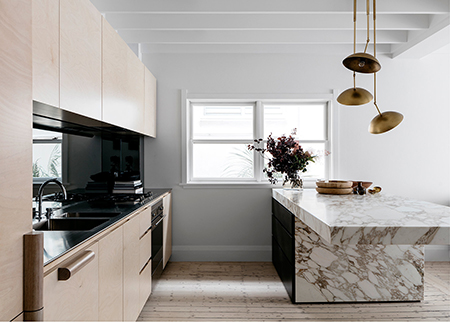 Materiales que siguen en la ola del diseño como el latón, abedul contrachapado y mármol. Proyecto del estudio